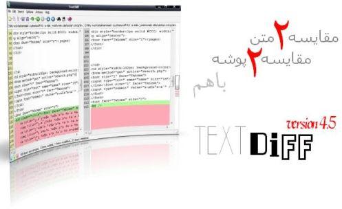 نرم افزار TextDiff برنامه اي است كه با آن مي توان به سرعت و سهولت تفاوت ميان دو نوشته و دو فايل را دريافت كرد و آنها را با هم مقايسه نمود شما توسط اين برنامه مي توانيد انتخاب كنيد كه نرم افزار به بزرگ کوچکي حروف حساسيت نشان ندهد يا تفاوت در فضاي خالي (space) را در نظر نگيرد همچنين نرم افزار قادر خواهد بود محتويات دو پوشه را نيز با هم مقايسه كند . برنامه از زبان فارسي پشتيباني نمي كند و فقط قدرت تفكيك حروف لاتين را دارا مي باشد